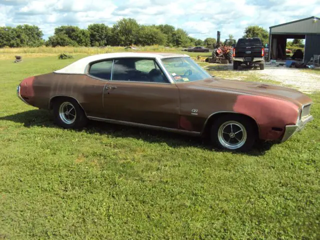 1970 BUICK GS, GREAT RUNNING, DRIVING PROJECT CAR. TRUE GS, ENGINE IS NOT ORIGINAL, BUT RUNS VERY GOOD, ITS A 350 2-BARREL, AUTO TRANNY SHIFTS WELL, BRAKES WORK WELL. FRAME IS EXCELLENT, FLOORS ARE VERY GOOD, INTERIOR IS IN VERY GOOD SHAPE, HEADLINER IS EXCELLENT, DASH IS EXCELLENT, PAD HAS NO CRACKS, DOOR PANELS ARE GREAT, BACK SEAT IS EXCELLENT, FRONT SEAT IS VERY GOOD, BUT HAS A RIP IN THE DRIVER SIDE. THIS CAR HAS A FACTORY TACH AND GAUGES DASH, BUT THEY ARE CURRENTLY NOT WORKING. ALSO HAS FACTORY REAR WINDOW DEFOGGER. ALL GLASS IS GOOD EXCEPT THE WINDSHIELD WHICH IS CRACKED. IT WAS ORIGINALLY A VINYL TOP CAR BUT MOST OF THE VINYL IS GONE, THE METAL ON THE ROOF IS IN GOOD CONDITION. BODY WISE, THE QUARTERS WILL NEED SOME WORK, THE TRUNK PAN WILL NEED REPLACED, DOORS ARE VERY GOOD, FRONT FENDERS WILL NEED WORK, CORE SUPPORT HAS RUST IN THE BATTERY AREA, TRUNK LID AND SEAL AREA ARE EXCELLENT, HOOD IS IN VERY GOOD SHAPE AS WELL WITH NO ROT BUT A SMALL DENT ON THE FRONT. SOLD AS IS, WILL NEED RESTORATION.