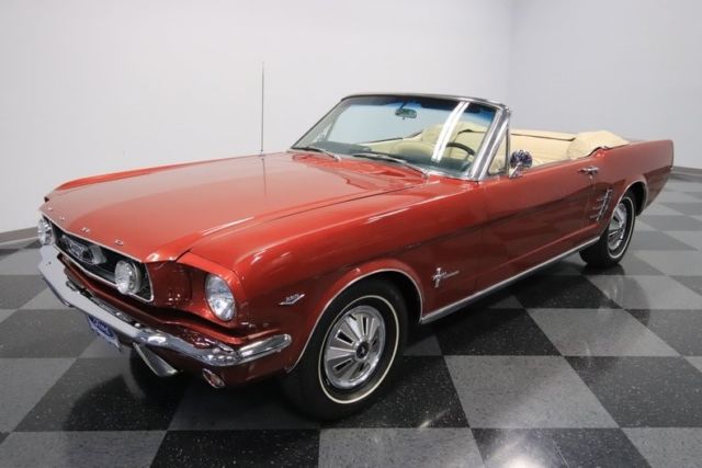Everyone can agree that a bright red Mustang convertible is about as good as open-air motoring gets, and this 1966 Ford Mustang convertible does it all the best. After all, it had a high quality restoration that includes glossy paint, an A/C interior, and extra power from a 302 V8. When you start to look over this droptop just remember: subtle upgrades. For example, a Mustang dressed in red is iconic, but when you render it in a... deeper shade of burgundy, it gets extra attention when hanging out with the other classics. And the paint had extra attention during restoration so that this sunshine-friendly droptop has a terrific luster in the sunlight. The brightwork was invested in so that it can rival for shine. It looks great, including on the upgraded GT grille that gives this convertible an extra sporty appearance. And all the details are correct, right down to the factory wheel covers. But the new Pirelli Cinturato tires help signal that there have been investments upgrading this to be a true driver's classic. While the white folding roof looks great against the paint, with the touch of a button, it powers down to reveal the biscuit-like beige interior that really complements the premium burgundy package. So you can't lose with the top up or down! Just like the outside, keep your eyes out for the subtle upgrades where serious thought and investment was put into making sure this pony car is keeping you comfortable. It starts with the excellent condition of the bucket seats, door panels, and dash. You now have a more modern arm rest center console that has the addition of cup holders, too. This black piece coordinates nicely with the carpeting, dash inserts, and steering wheel to easily blend this modern addition. Plus, you can listen to more modern music with the AM/FM/cassette stereo with a knob-style setup that doesn't look out of place in this classic. But your favorite piece will the original-style air conditioner that's keeping you comfortable with the top down long into the summer season. The badges on the fender and air topper might say 289, but the engine bay keeps with this car's theme of upgrades. This one is powered by a 302 cubic-inch V8 motor, which is larger than anything you could get in a Mustang for 1966. Of course, it's up to you to tell anyone about this upgrade, because this engine bay looks so correct. Not only does it have the bold blue block and matching valve covers, but they really paid attention to details. So it looks correct, down to the decals, hoses, and reproduction factory tags. And everything looks so fresh because there's only about 150 miles on this since its restoration! In fact, the level of detail goes into the undercarriage where you'll spot everything from fresh suspension components to the correct red oxide paint. And because you'll want to be showing this droptop off everywhere, it comes with great driving features like power steering, power brakes, and a three-speed automatic transmission. Complete with owner's manual, here's the perfect open road package where the roof goes down with the touch of a button, and the V8 hustles you along better than the rest of the pony heard. This nicely invested cut-above convertible is going fast, so call today!